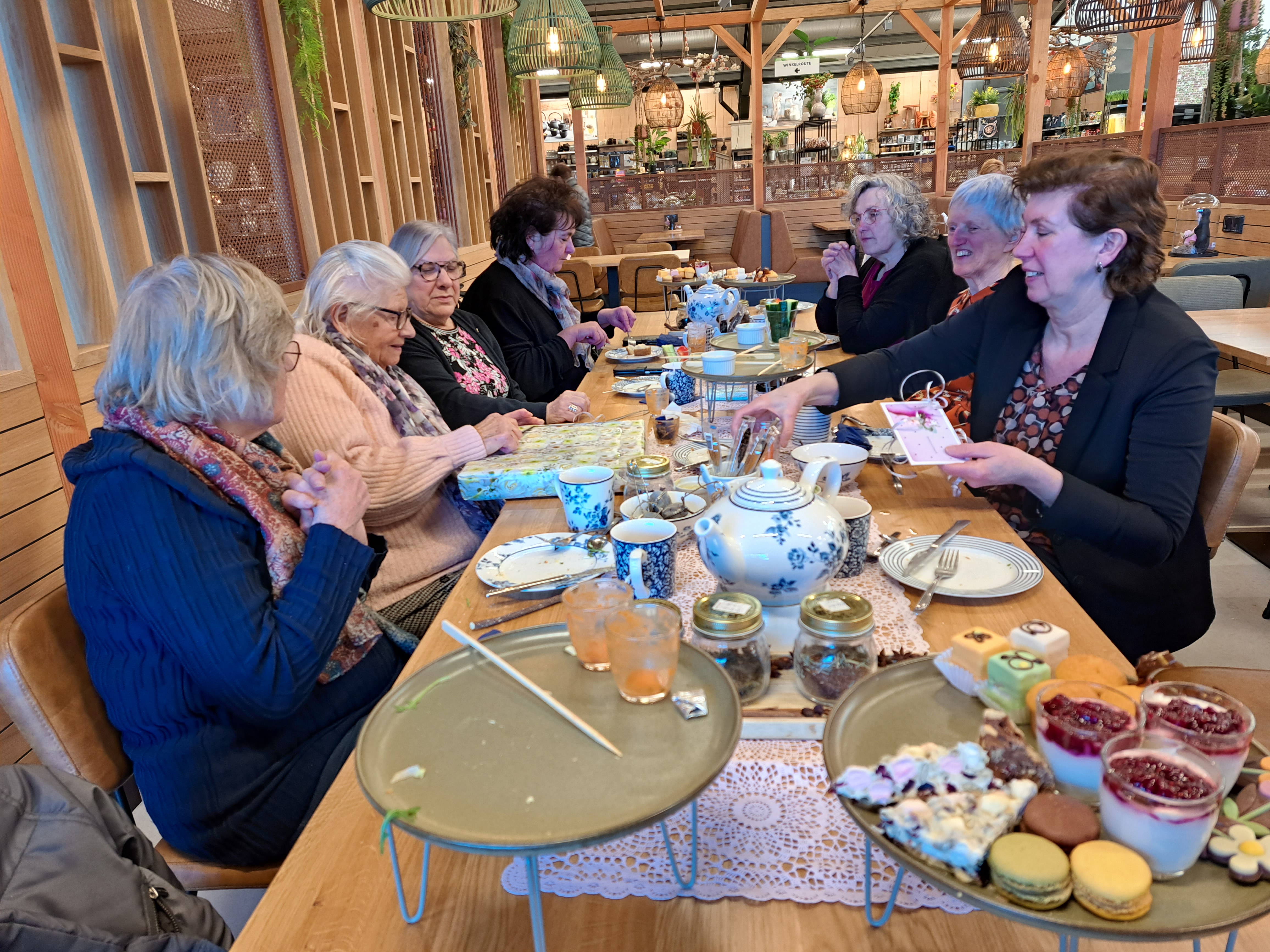 Afgelopen eind januari 2023 is de nestor van onze club, An Cuijpers, 90 jaar geworden. Het behalen van deze bijzondere leeftijd heeft ze inmiddels met haar familie gevierd in een warm en bijzonder samenzijn. Afgelopen maandag 13 februari trakteerde An ons op een heerlijke en gezellige high tea in een tuincentrum. We begonnen de middag feestelijk met het toezingen van de jarige Job. Jullie begrijpen het natuurlijk wel: toen er vervolgens voldoende te kletsen en te snoepen (en te knoeien) viel, was voor de SKO-tjes het feestje al bij voorbaat geslaagd. Zo zijn wij nu ook wel weer 😊