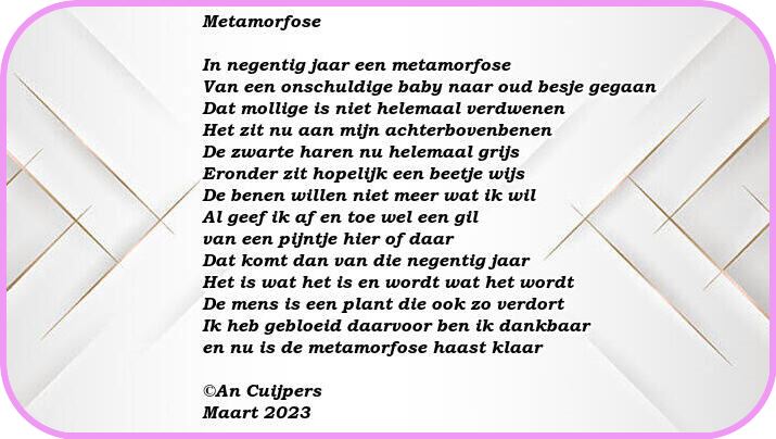Behalve in de vier bundels van de SKO, heeft An ook in eigen beheer twee gedichtenbundels gepubliceerd: “Kruimels van zoete en bitterkoekjes” en (samen met dochter Gerrie) “In de voetsporen van mijn moeder”.